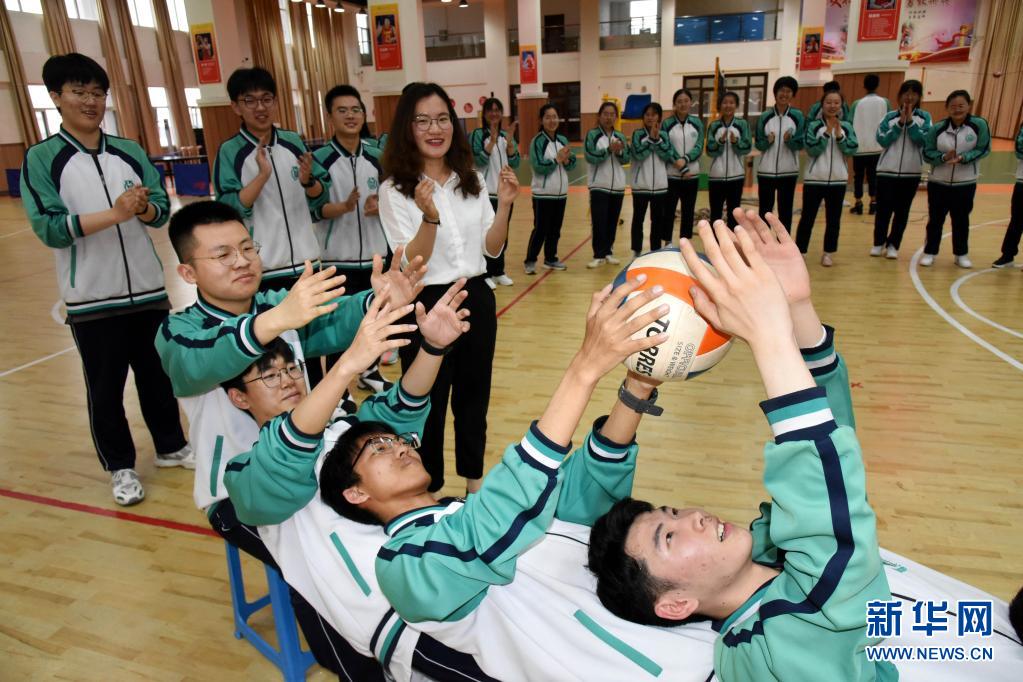 5月23日,青島通濟實驗學(xué)校高三學(xué)生在進行“躺椅傳球”游戲。