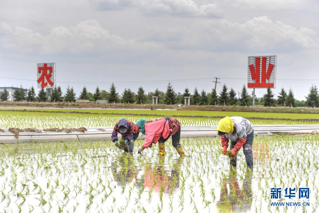 5月26日,在吉林省吉林市永吉縣萬昌鎮(zhèn)宇豐米業(yè)2萬畝高標準水田基地,農(nóng)民進行水稻補苗工作。