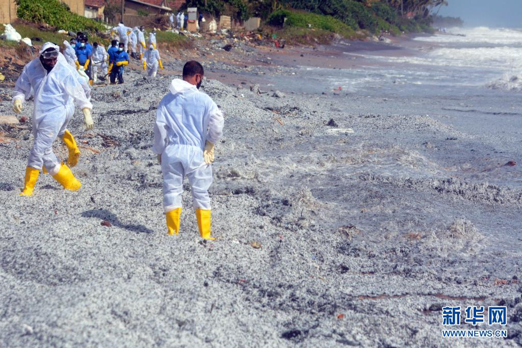 5月27日,安全人員在距離科倫坡30多公里的斯里蘭卡西海岸城市尼甘布清理被海水沖到這里的集裝箱船“X-PRESS PEARL”的碎片。