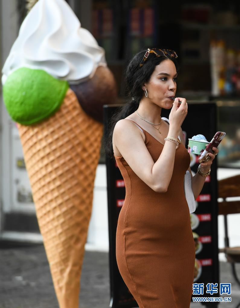 6月17日,在德國(guó)法蘭克福,一名女子手拿冰激凌從街頭走過(guò)。