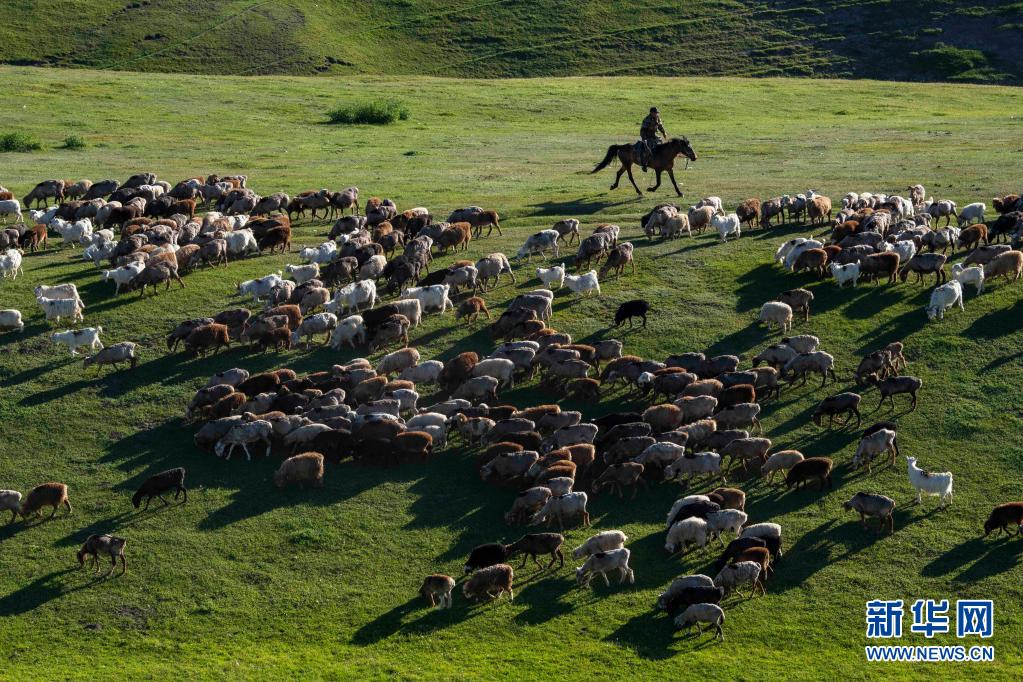 新疆裕民縣的牧民在巴爾魯克山區(qū)夏牧場上放牧(6月14日攝)。