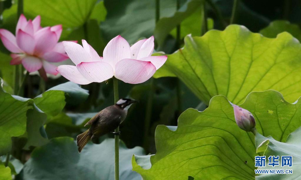 6月21日,在江蘇蘇州拙政園,一只小鳥在荷塘間小憩。