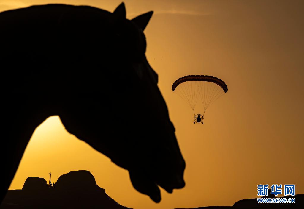 游客乘坐動(dòng)力傘在新疆克拉瑪依烏爾禾世界魔鬼城景區(qū)內(nèi)游玩(6月21日攝)。