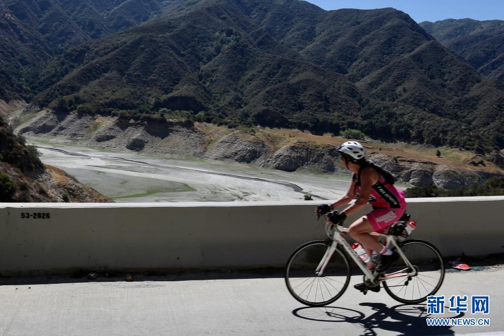 6月24日,一名女子騎車(chē)經(jīng)過(guò)美國(guó)加利福尼亞州洛杉磯縣阿祖薩市附近的圣加布里埃爾水庫(kù)。