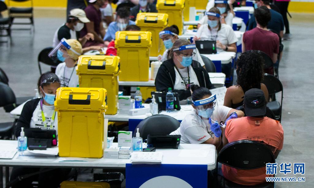 6月27日,在加拿大多倫多,人們在大型新冠疫苗接種中心接種疫苗。