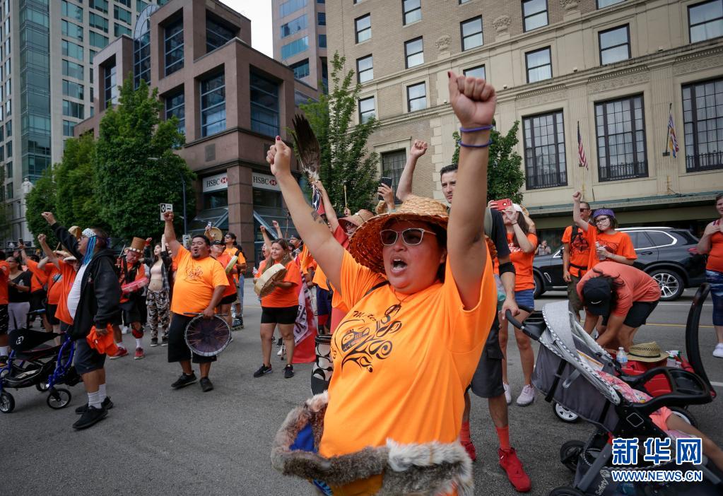 當(dāng)天是加拿大日,上千名抗議者在溫哥華集會,悼念加拿大在強(qiáng)制“同化”原住民過程中遭到殘害的兒童,呼吁取消加拿大日的慶?;顒?。