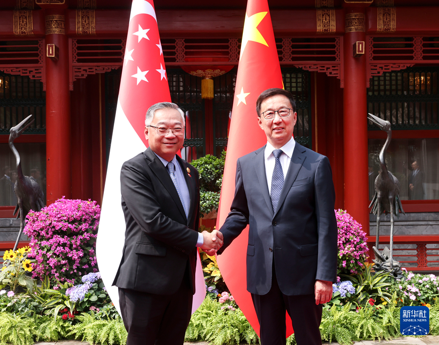 9月4日,国家副主席韩正在北京会见来华出席纪念中国人民抗日战争暨世界反法西斯战争胜利80周年活动的新加坡副总理兼贸工部长颜金勇。