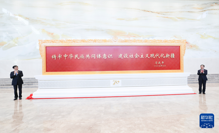 9月25日下午,中共中央政治局常委、全国政协主席、中央代表团团长王沪宁带领中央代表团出席向新疆维吾尔自治区赠送纪念品仪式。中央代表团向新疆赠送了习近平总书记题词贺匾、中华同心尊等纪念品。这是王沪宁和新疆维吾尔自治区党委书记陈小江一同为贺匾揭幕。