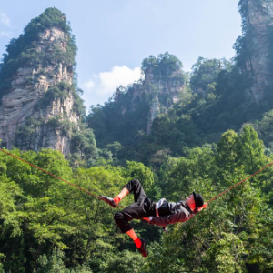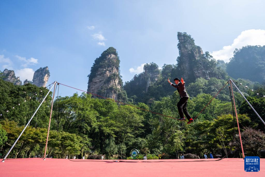 10月11日,来自俄罗斯的演员在张家界国家森林公园进行软钢丝杂技表演。