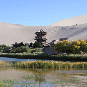 金秋时节,甘肃省敦煌市鸣沙山月牙泉景区景色如画,众多游客徜徉其中,感受大漠风情。