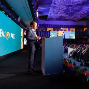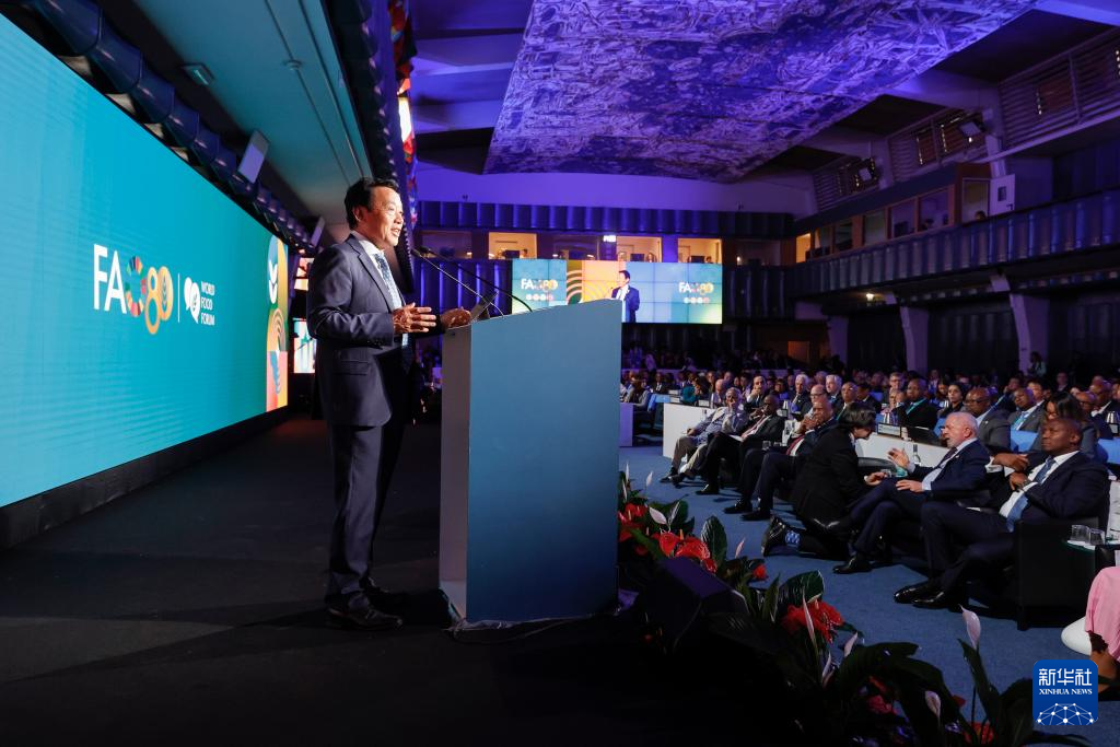 10月13日,在意大利罗马,联合国粮农组织总干事屈冬玉在2025年世界粮食论坛开幕式上讲话。