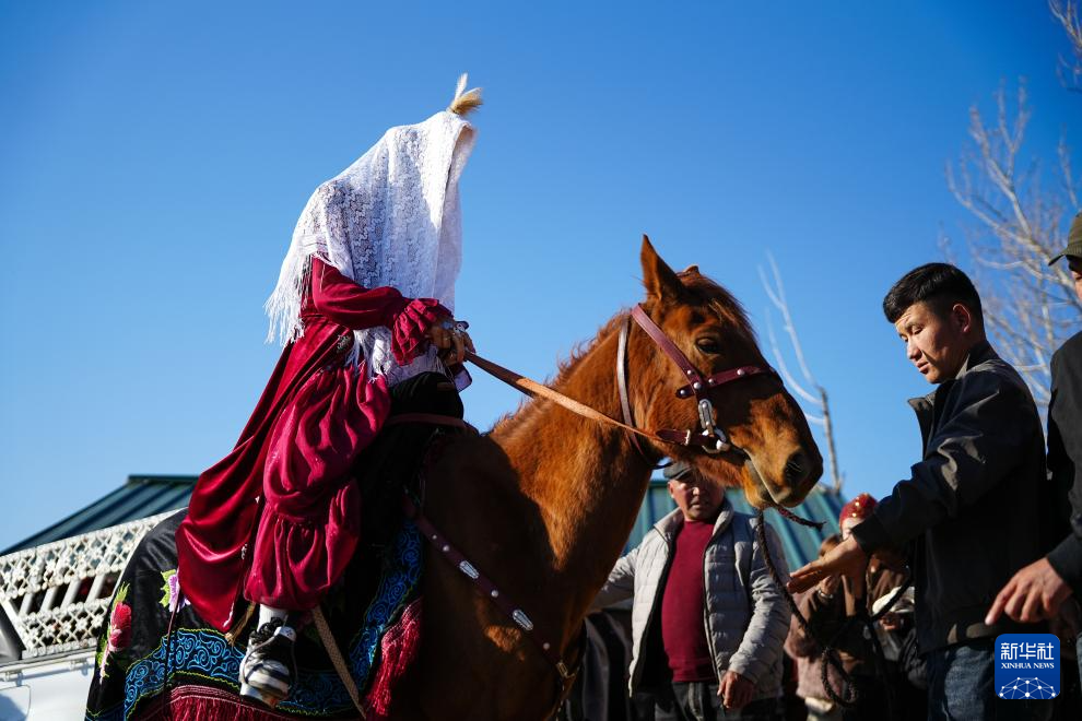 中午,车队抵达加尔阔拉村后,三位乐手弹奏着冬不拉、手风琴、吉他,边走边唱,将新娘迎至布开汗家中小院。民间艺人阿肯弹着冬不拉,带着新娘向男方父母及亲戚行礼,其间,有长辈揭开孔吐斯的面纱,送上祝福。随后,男方亲友协力将被子、家用电器等嫁妆搬进小院。