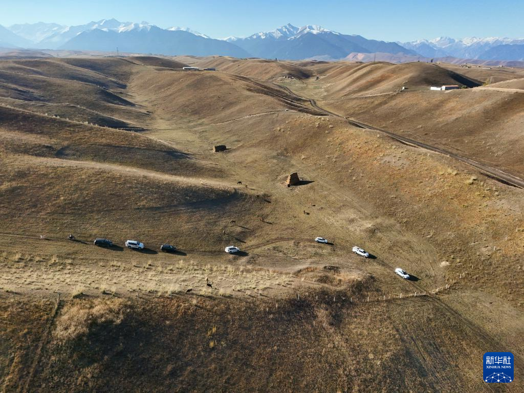 迎亲车队离开冬季牧场,前往新郎家(10月11日摄,无人机照片)。