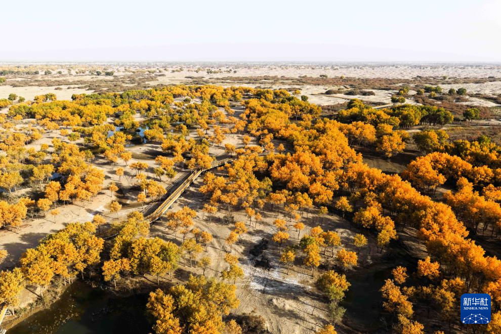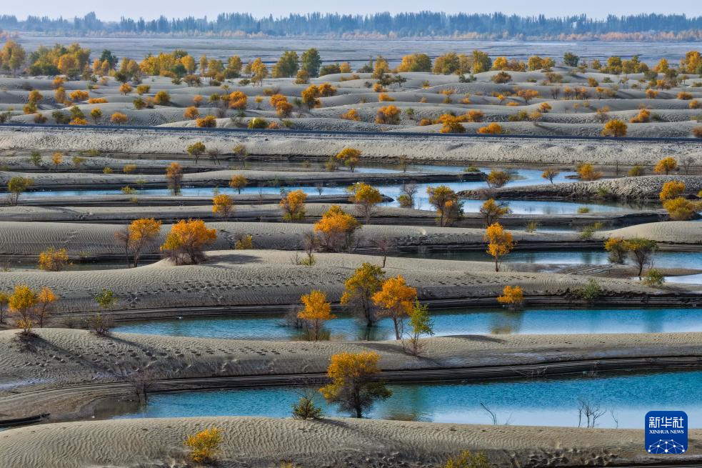 时下,新疆和田地区的胡杨迎来最佳观赏期,成片换妆的胡杨林与水天相映,共绘金秋美景。