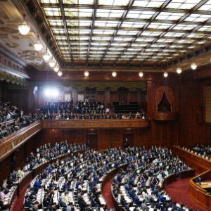 10月21日,在日本东京,自民党总裁高市早苗(前排右二)在临时国会众议院首相指名选举现场阅读文件。