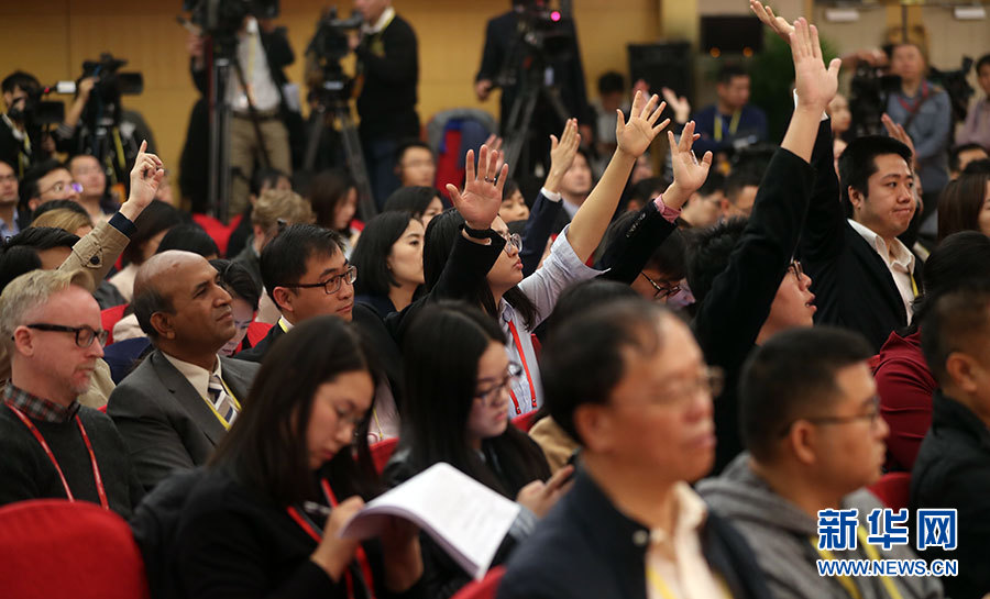 10月21日,十九大新聞中心舉辦記者招待會,邀請中共中央統(tǒng)戰(zhàn)部常務(wù)副部長張裔炯、副部長冉萬祥,中共中央對外聯(lián)絡(luò)部副部長郭業(yè)洲介紹黨的統(tǒng)一戰(zhàn)線工作和黨的對外交往情況,并回答記者提問。圖為現(xiàn)場記者。新華網(wǎng) 郝廣鵬攝