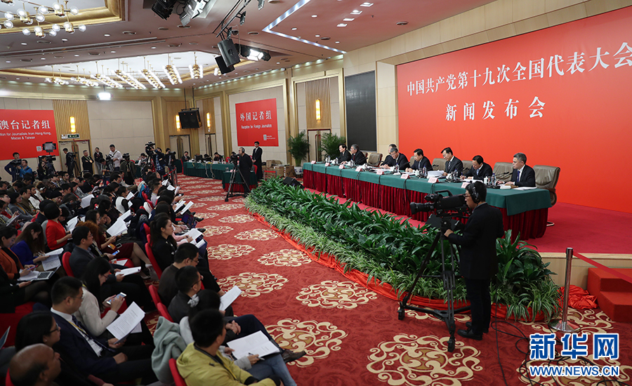 10月26日上午10:00,中國(guó)共產(chǎn)黨第十九次全國(guó)代表大會(huì)新聞發(fā)言人在梅地亞賓館二層新聞發(fā)布廳召開專題新聞發(fā)布會(huì),請(qǐng)有關(guān)方面負(fù)責(zé)人解讀十九大報(bào)告,并回答記者關(guān)心的問題。圖為新聞發(fā)布會(huì)現(xiàn)場(chǎng)。新華網(wǎng) 翟子赫 攝