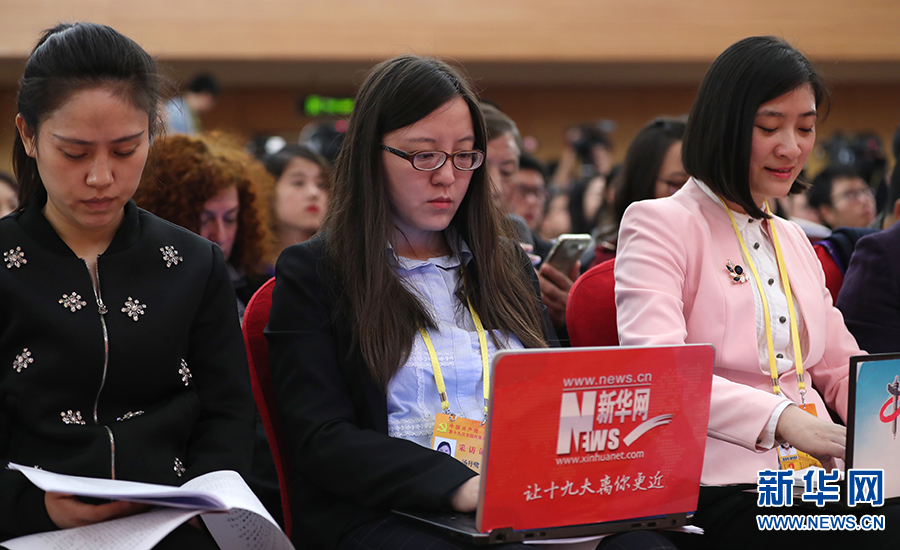 10月26日上午10:00,中國共產(chǎn)黨第十九次全國代表大會新聞發(fā)言人在梅地亞賓館二層新聞發(fā)布廳召開專題新聞發(fā)布會,請有關方面負責人解讀十九大報告,并回答記者關心的問題。圖為現(xiàn)場媒體記者。新華網(wǎng)?翟子赫 攝