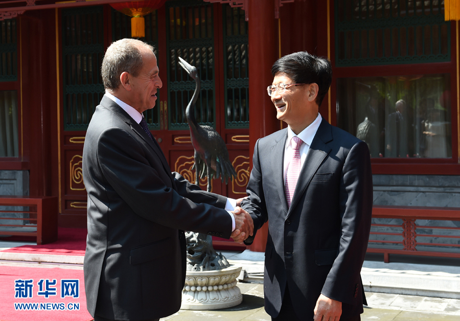 ??? 9月7日,中共中央政治局委員、中央政法委書記孟建柱在釣魚臺國賓館會見由主席佩里率領(lǐng)的英國48家集團(tuán)俱樂部代表團(tuán)。 新華社記者張領(lǐng)攝