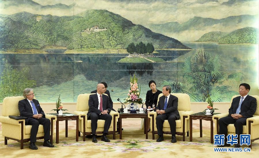 ??? 9月30日,國務(wù)院副總理馬凱在北京人民大會(huì)堂會(huì)見來訪的瑞士聯(lián)邦委員兼內(nèi)政部長阿蘭·貝爾塞一行。 新華社記者 張鐸 攝