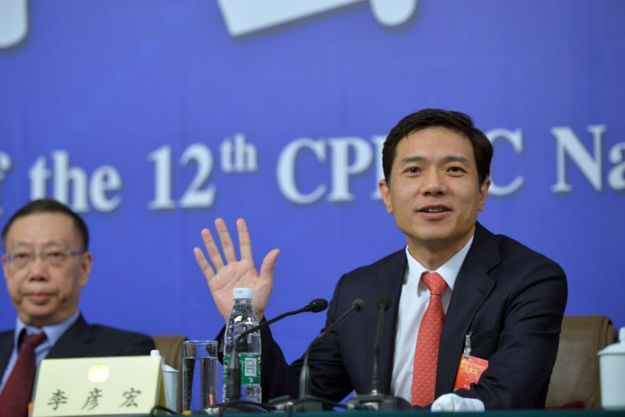 ??? 全國(guó)政協(xié)十二屆三次會(huì)議舉行記者會(huì),邀請(qǐng)全國(guó)政協(xié)常委朱維群、黃潔夫和全國(guó)政協(xié)委員胡曉義、李彥宏、俞敏洪等談促進(jìn)民生改善與社會(huì)和諧穩(wěn)定,并回答記者提問(wèn)。圖為李彥宏答記者問(wèn)。新華網(wǎng)/中國(guó)政府網(wǎng) 郭小天 攝