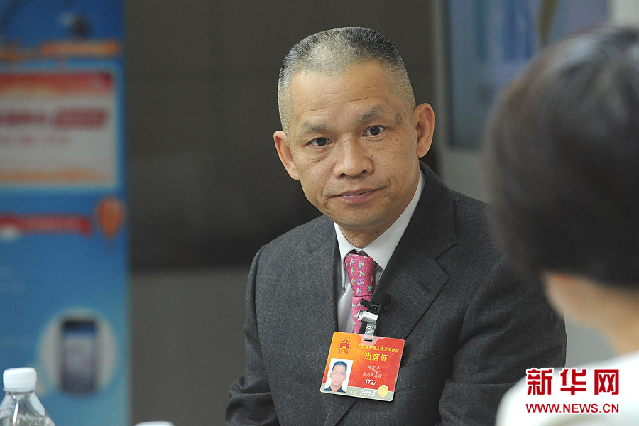 2015年3月13日,全國(guó)人大代表、湖南科力遠(yuǎn)新能源股份有限公司董事長(zhǎng)鐘發(fā)平做客新華會(huì)客廳。圖為鐘發(fā)平與主持人交談。新華網(wǎng)?賈振 攝