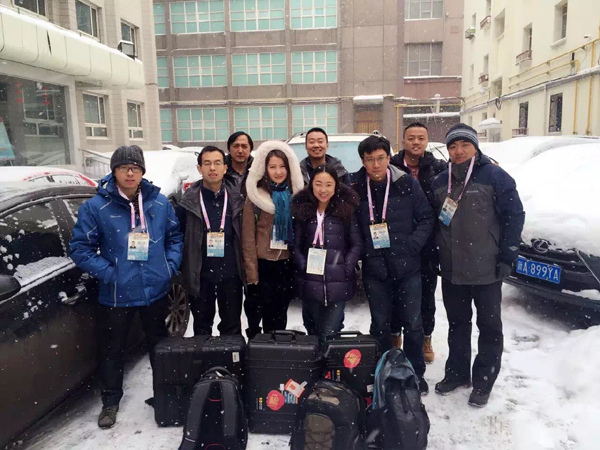 圖為2016年的風雪中,記者與同事們一道參與在烏魯木齊舉辦的“第十三屆全國冬季運動會”報道。