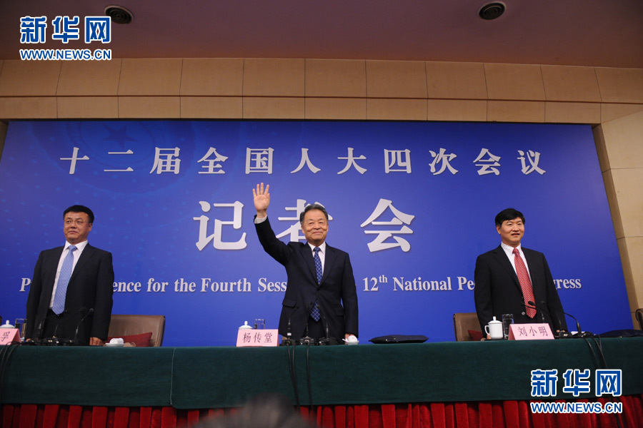 十二屆全國(guó)人大四次會(huì)議新聞中心于3月14日(星期一)10時(shí)在梅地亞中心多功能廳舉行記者會(huì),邀請(qǐng)交通運(yùn)輸部部長(zhǎng)楊傳堂、交通運(yùn)輸部運(yùn)輸服務(wù)司司長(zhǎng)劉小明、北京交通發(fā)展研究中心主任郭繼孚就“深化出租汽車(chē)改革與發(fā)展”的相關(guān)問(wèn)題回答中外記者的提問(wèn)。圖為楊傳堂、劉小明、郭繼孚到達(dá)會(huì)場(chǎng),楊傳堂向記者揮手致意。新華網(wǎng)/中國(guó)政府網(wǎng) 陳杰 攝?