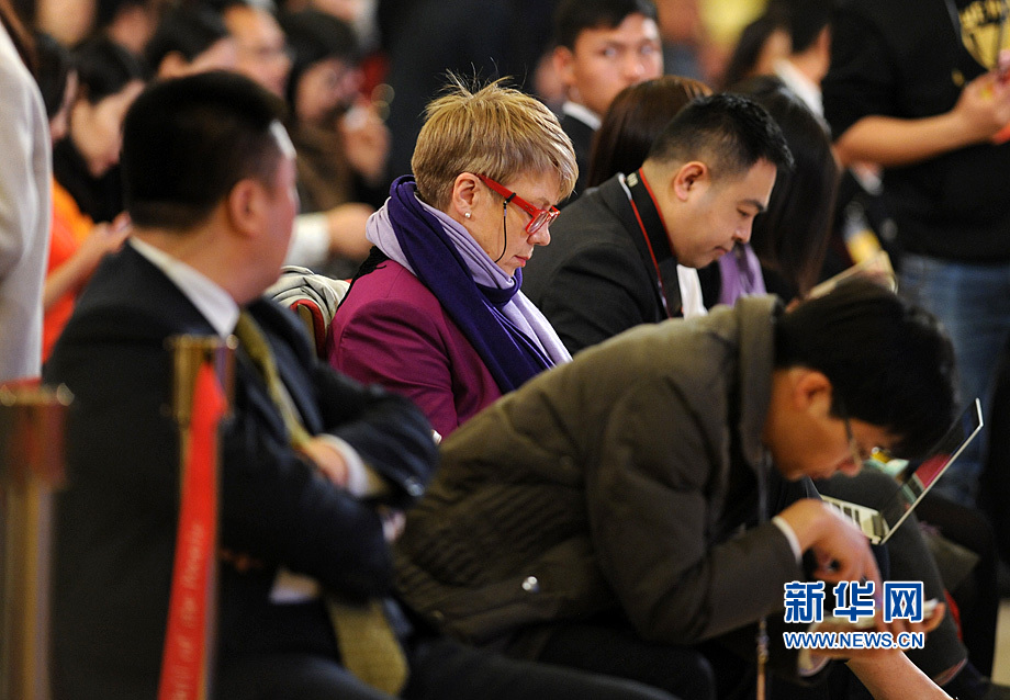 3月16日上午,國務(wù)院總理李克強(qiáng)在人民大會堂三樓金色大廳會見采訪十二屆全國人大四次會議的中外記者并回答記者提出的問題。圖為早早趕到記者會現(xiàn)場的各路媒體記者。新華網(wǎng)/中國政府網(wǎng) 陳競超 攝