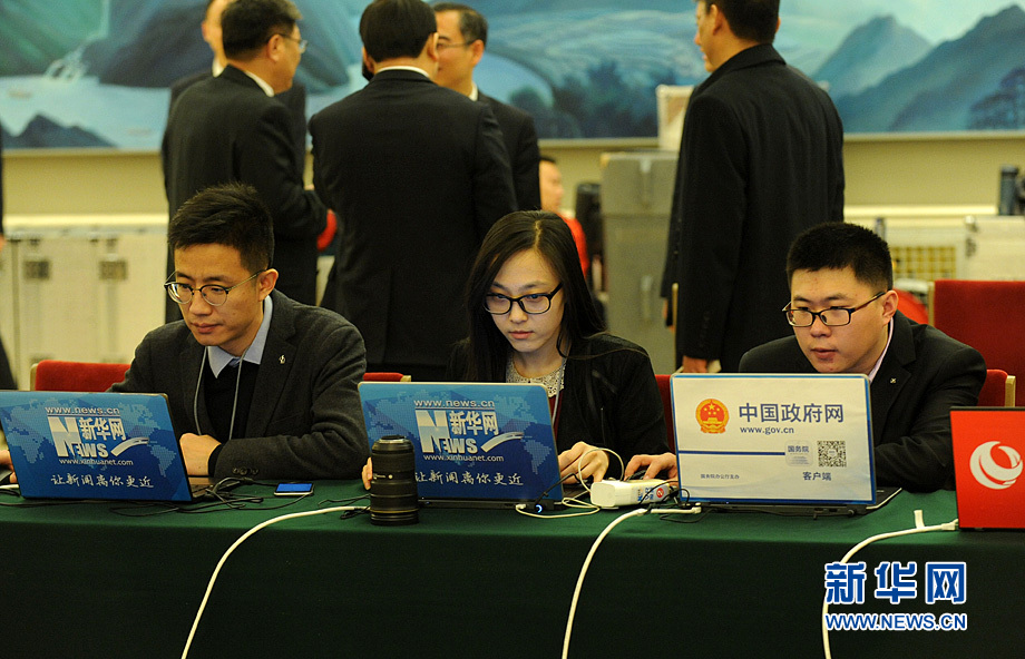 3月16日上午,國務(wù)院總理李克強(qiáng)在人民大會(huì)堂三樓金色大廳會(huì)見采訪十二屆全國人大四次會(huì)議的中外記者并回答記者提出的問題。圖為新華網(wǎng)、中國政府網(wǎng)記者在做直播準(zhǔn)備。新華網(wǎng)/中國政府網(wǎng) 陳競超 攝