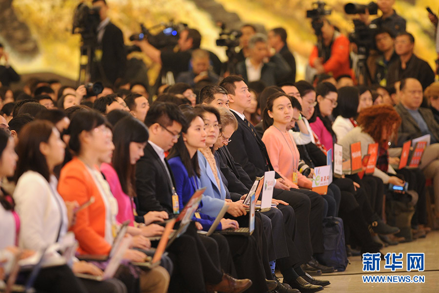3月16日上午,國務(wù)院總理李克強(qiáng)在人民大會堂三樓金色大廳會見采訪十二屆全國人大四次會議的中外記者并回答記者提出的問題。圖為記者會現(xiàn)場。新華網(wǎng)/中國政府網(wǎng) 陳杰攝
