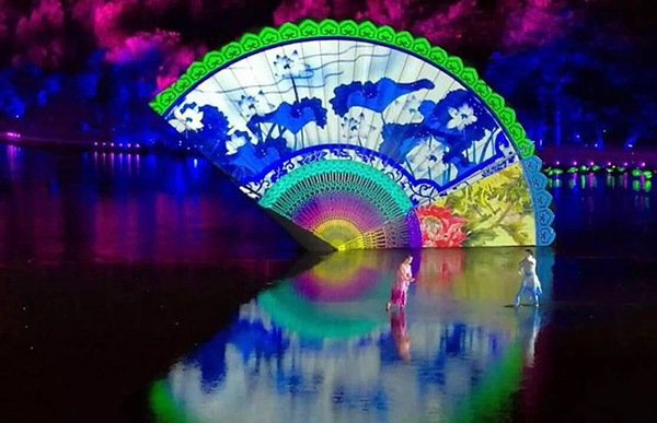2016年9月4日晚,一場名為“最憶是杭州”的文藝演出在杭州西子湖畔進行室外表演。隨著《春江花月夜》《采茶舞曲》帶著中國傳統(tǒng)文化的韻律登臺表演,360度巨型圓扇在水面上完美地映射出來,點燃了文藝晚會的高潮。