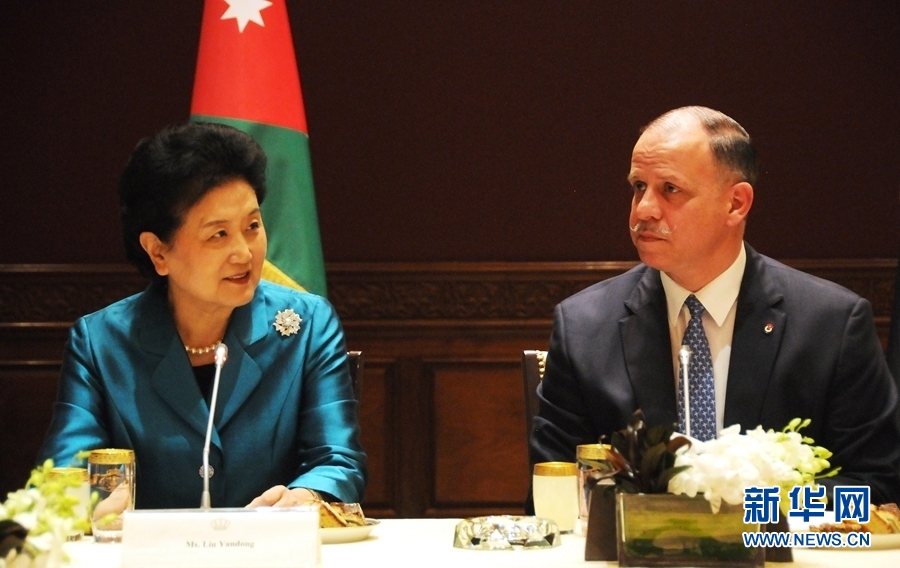 4月20日,在約旦首都安曼,約旦代國王費薩爾(右)會見中國國務(wù)院副總理劉延東。新華社記者林曉蔚攝