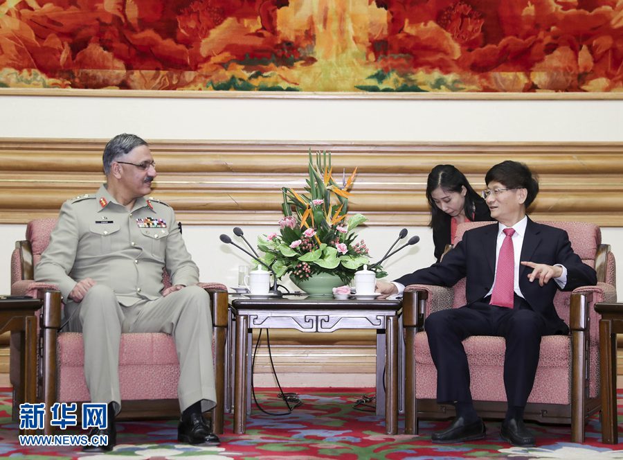 6月16日,中共中央政治局委員、中央政法委書(shū)記孟建柱在北京中南海會(huì)見(jiàn)巴基斯坦參謀長(zhǎng)聯(lián)席會(huì)議主席祖拜爾。 新華社記者 丁林 攝