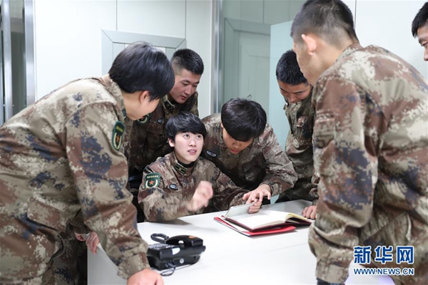 11月2日,黨的十九大代表、吉林省軍區(qū)數(shù)據(jù)信息室助理工程師張燕兵(中)來到吉林省軍區(qū)綜合訓練隊宣講十九大精神。新華社發(fā)(屈雷宇攝)