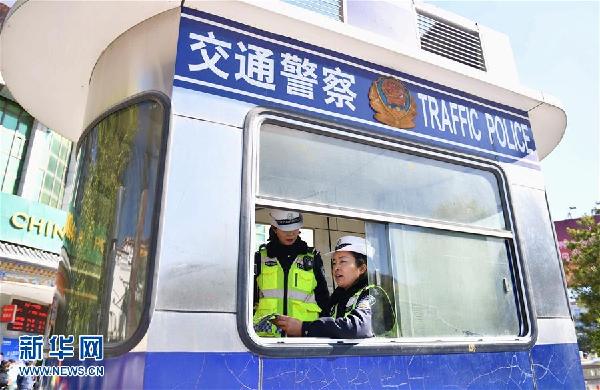 強(qiáng)巴卓瑪(右)和同事在拉薩布達(dá)拉宮腳下的交警崗?fù)?zhí)勤(11月2日攝新華社記者 晉美多吉 攝