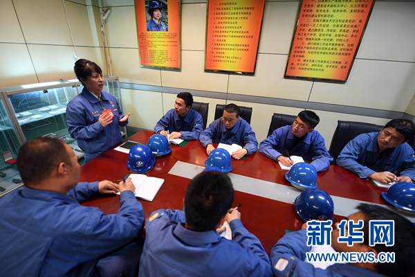 在甘肅酒鋼集團(tuán)宏興鋼鐵股份有限公司碳鋼薄板廠內(nèi)的王云平勞模創(chuàng)新工作室,王云平(左二)宣講黨的十九大精神(11月1日攝)?! ⌒氯A社記者 范培珅 攝