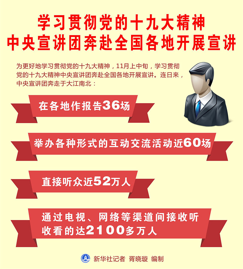 為更好地學(xué)習(xí)貫徹黨的十九大精神,11月上中旬,學(xué)習(xí)貫徹黨的十九大精神中央宣講團(tuán)奔赴全國(guó)各地開展宣講。連日來,中央宣講團(tuán)奔走于大江南北,在各地作報(bào)告36場(chǎng),舉辦各種形式的互動(dòng)交流活動(dòng)近60場(chǎng),直接聽眾近52萬人,通過電視、網(wǎng)絡(luò)等渠道間接收聽收看的達(dá)2100多萬人。