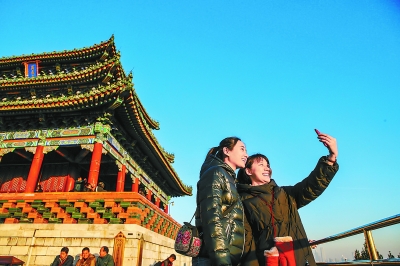 昨天天氣晴朗,在景山萬春亭,游客飽覽京城風(fēng)景,愉快留影。實習(xí)記者 武亦彬攝