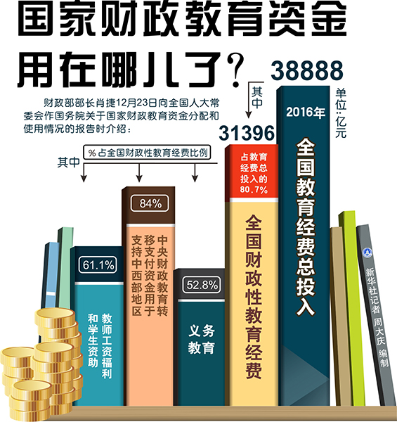 新華社北京12月23日電(記者胡浩郁瓊源)受國務(wù)院委托,財(cái)政部部長肖捷23日向全國人大常委會(huì)作國務(wù)院關(guān)于國家財(cái)政教育資金分配和使用情況的報(bào)告時(shí)介紹,2016年我國財(cái)政性教育經(jīng)費(fèi)一半以上用于義務(wù)教育,一半以上用于中西部地區(qū)并向農(nóng)村傾斜,一半以上用于教師工資福利和學(xué)生資助。