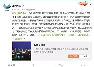 新京報此前報道,12月10日,湖南東安縣組織部發(fā)布的一份“干部簡歷公示”通告引發(fā)廣泛質(zhì)疑。多名永州當?shù)鼐W(wǎng)友發(fā)文稱,名單中擬提拔人員簡歷,其中有干部工作經(jīng)歷存在疑點。
