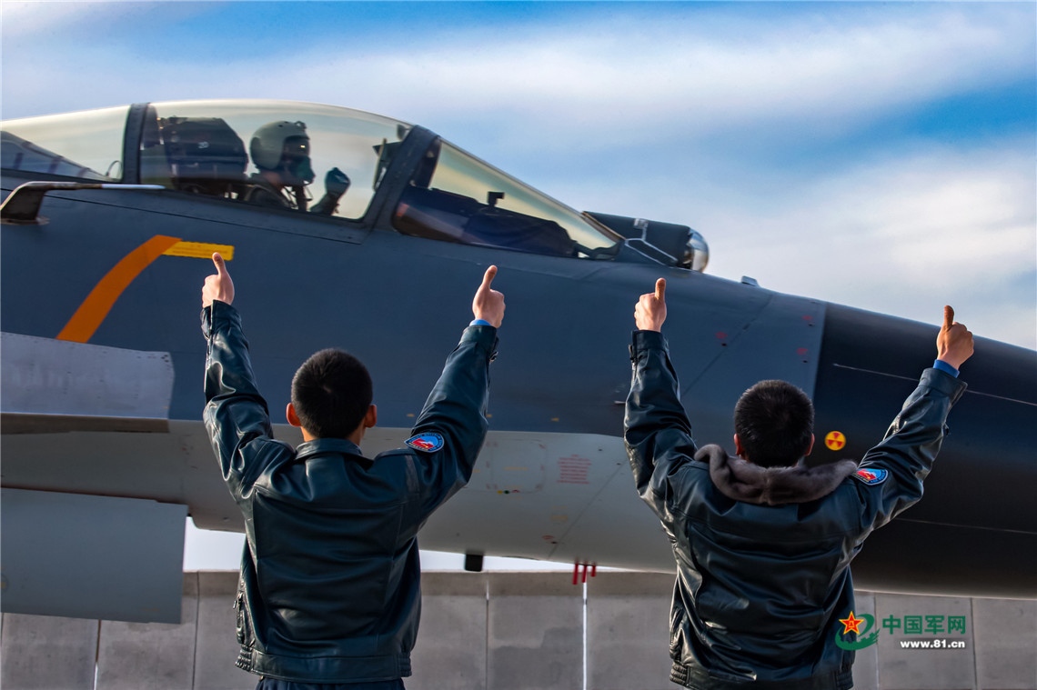 “金頭盔-2017”空軍對(duì)抗空戰(zhàn)競(jìng)賽考核,戰(zhàn)機(jī)滑出,飛行員為戰(zhàn)友鼓勁加油。楊盼 攝影