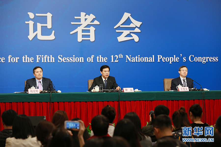 3月11日,十二屆全國人大五次會議新聞中心舉行記者會,主題是“改革開放調(diào)結(jié)構(gòu) 創(chuàng)新驅(qū)動促發(fā)展”,商務(wù)部部長鐘山、副部長王受文、副部長錢克明出席并回答中外記者的提問。圖為記者會現(xiàn)場。 新華網(wǎng)/中國政府網(wǎng) 傅義洲 攝