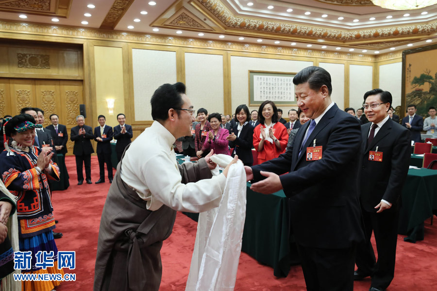 2017年3月8日,習(xí)近平參加十二屆全國人大五次會議四川代表團(tuán)的審議。習(xí)近平走進(jìn)會場時,身著民族服裝的藏族、彝族、羌族代表向總書記問好。這是藏族代表獻(xiàn)上潔白的哈達(dá)。新華社記者蘭紅光攝
