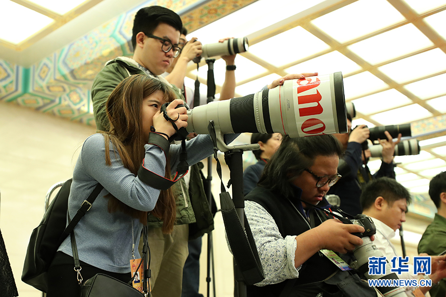 3月15日上午,國務(wù)院總理李克強(qiáng)在人民大會堂三樓金色大廳會見采訪十二屆全國人大五次會議的中外記者并回答記者提出的問題。圖為記者會現(xiàn)場的攝影記者。新華網(wǎng)/中國政府網(wǎng) 翟子赫 攝?