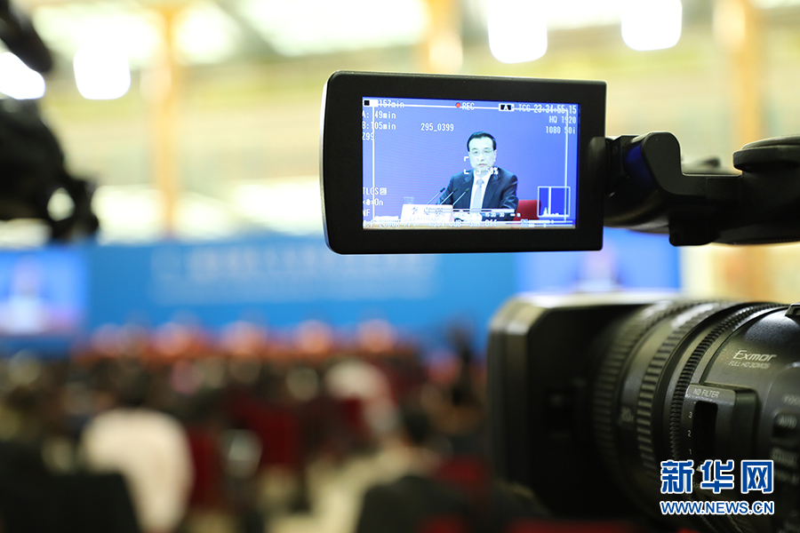 3月15日上午,國務(wù)院總理李克強(qiáng)在人民大會(huì)堂三樓金色大廳會(huì)見采訪十二屆全國人大五次會(huì)議的中外記者并回答記者提出的問題。圖為記者會(huì)現(xiàn)場(chǎng)。新華網(wǎng)/中國政府網(wǎng) 翟子赫 攝?