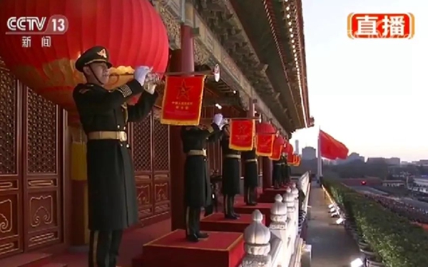 由軍樂(lè)團(tuán)八名禮號(hào)手在天安門(mén)城樓演奏《升旗號(hào)角》音樂(lè),增加了升旗儀式的神圣感與儀式感。八名禮號(hào)手經(jīng)過(guò)嚴(yán)格挑選,從技術(shù)到體貌都是最優(yōu)秀的,未來(lái)一年基本不會(huì)輪換。
