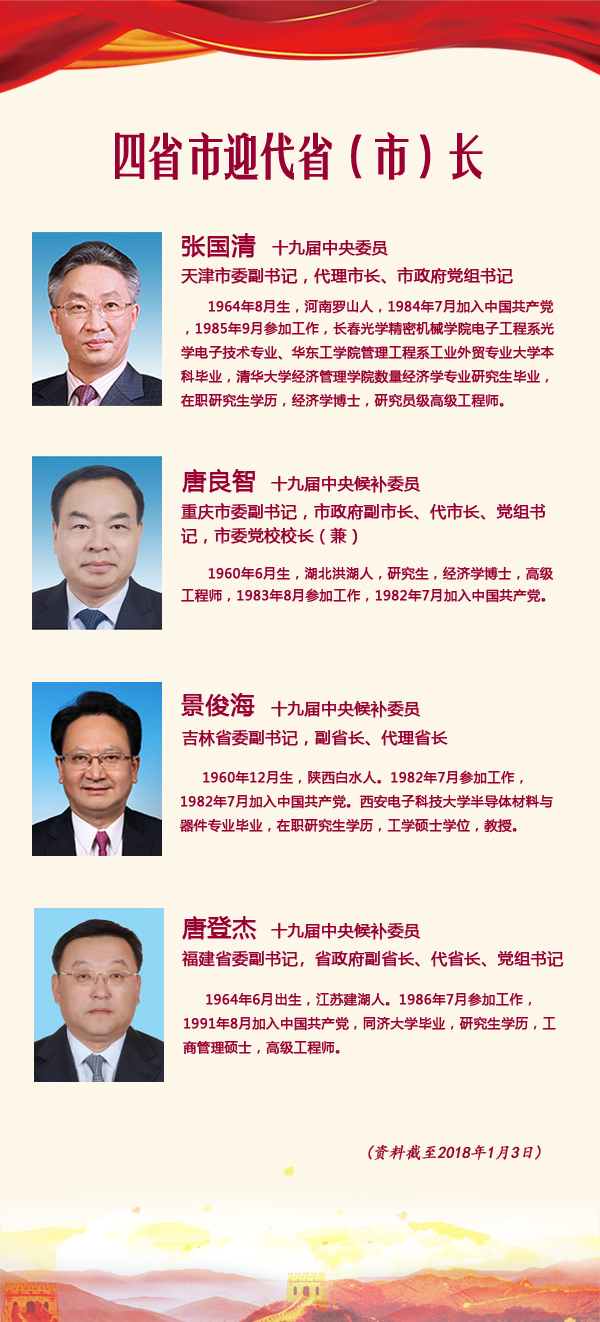 1月2日,天津、重慶、吉林、福建四省市調(diào)整政府“一把手”。其中,重慶市委副書(shū)記、市長(zhǎng)張國(guó)清調(diào)任天津市委副書(shū)記、代市長(zhǎng);重慶市委副書(shū)記唐良智擔(dān)任重慶市代市長(zhǎng);北京市委副書(shū)記景俊海調(diào)任吉林省委副書(shū)記、代省長(zhǎng);工信部副部長(zhǎng)、國(guó)家航天局局長(zhǎng)唐登杰出任福建省委副書(shū)記、代省長(zhǎng)。