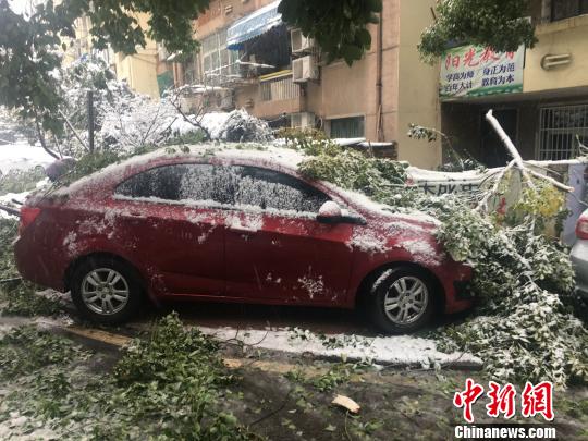 合肥一小區(qū)內(nèi),樹枝被積雪壓斷,砸在路邊停靠的車輛上。 趙強 攝
