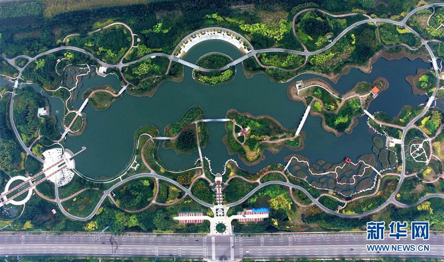 俯瞰天津?yàn)I海新區(qū)臨港經(jīng)濟(jì)區(qū)的臨港生態(tài)濕地公園(2016年10月21日攝)。臨港生態(tài)濕地公園多年來(lái)對(duì)工業(yè)區(qū)內(nèi)的污水和雨水進(jìn)行凈化處理和循環(huán)利用,污水經(jīng)二次處理達(dá)到1級(jí)A標(biāo)準(zhǔn),用于綠植灌溉等市政用水,減少污染物入海。新華社記者 岳月偉 攝